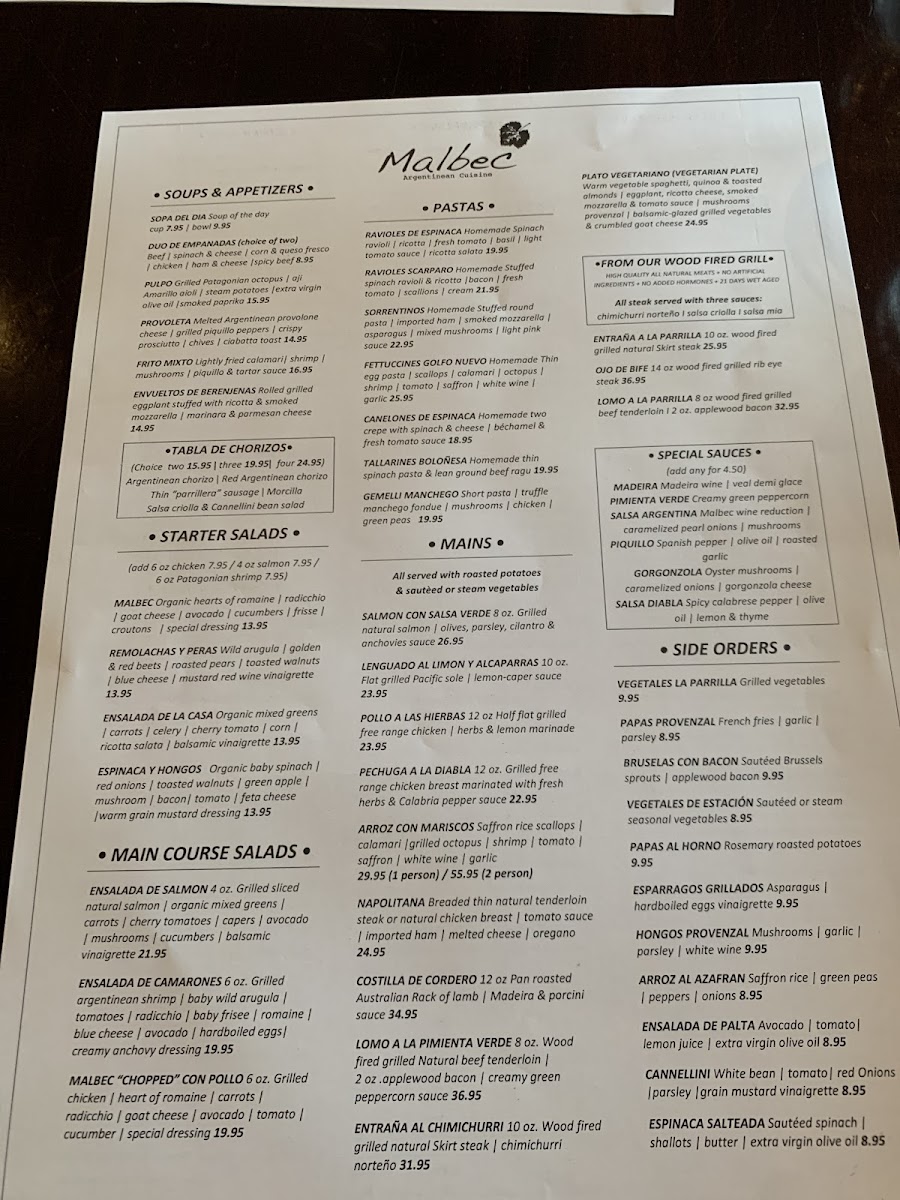 This menu suits casual and sit-down dining occasions where guests can choose from light pastas to hearty grilled dishes, complemented by traditional desserts and a focused wine list. It is appropriate for lunch, dinner, or special meals featuring Argentinian and South American flavors.